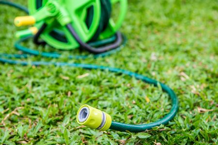 A yellow hose with a nozzle lies on a green lawn folded in rings on the garden. The concept of landscaping and park care. Copy space. Flat lay