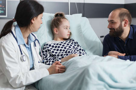 Smiling parent talking with fully recovered daughter about successful treatment results. Father talking to little girl about good diagnostic while in healthcare clinic pediatric recovery ward room.