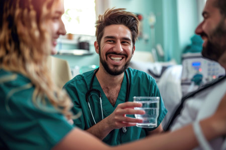 Hospital staff having fun chatting with each other during a break. A moment of camaraderie as hospital staff recharge with some lighthearted banter. Team spirit at its best!