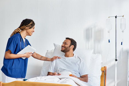 jolly african american nurse smiling happily at her indian patient that lying in hospital bed