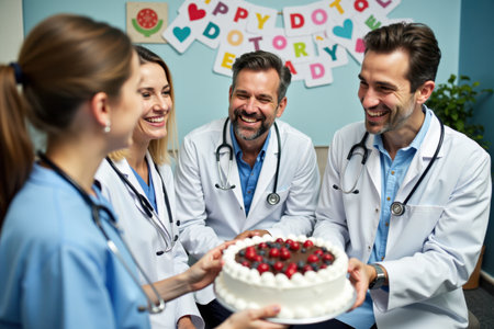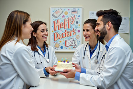 A group of doctors celebrating Doctor's Day in a clinic, sharing cake and laughter. A colorful Happy Doctor's Day poster decorates the background.