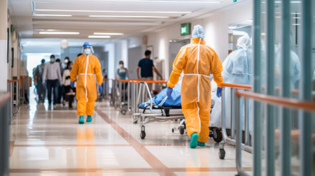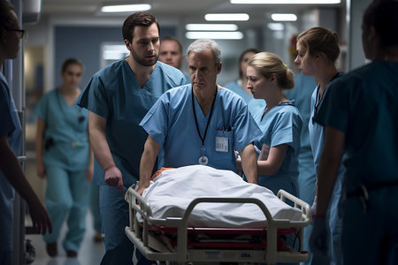 Emergency medical team swiftly transports injured patient on gurney to operating room in state-of-the-art hospital. Concept Emergency Response, Medical Transport, Injured Patient, Operating Room