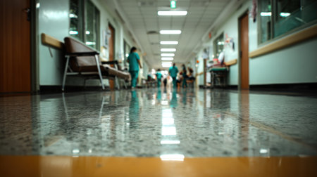 A long hospital corridor is depicted with a blurred focus, featuring walking figures and chairs. The scene showcases cool tones with highlights. This image may be suitable for various editorial and commercial applications, representing healthcare environments, waiting areas, and medical facility interiors.
