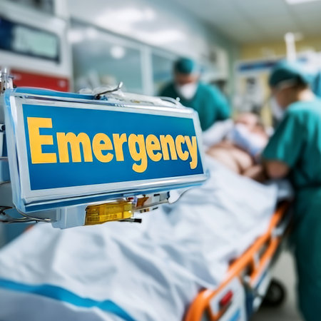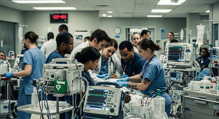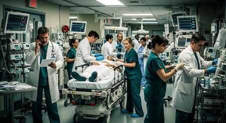 A busy emergency room with medical staff attending to a critically ill patient on a stretcher