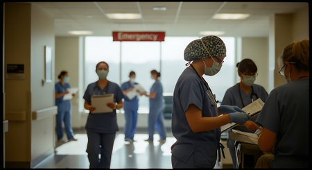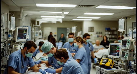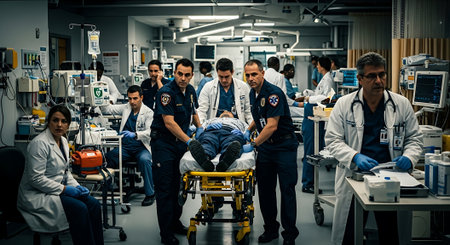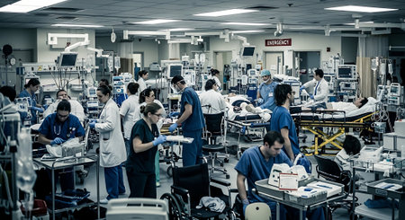 Medical professionals, including doctors, nurses, and surgeons, working in an emergency department, emphasizing teamwork and patient care in a busy hospital environment.