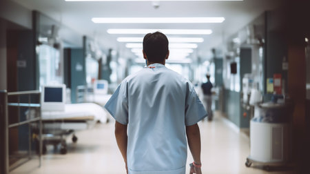Man in scrubs walking down hospital hallway with gurney in the foreground. Generative AI.