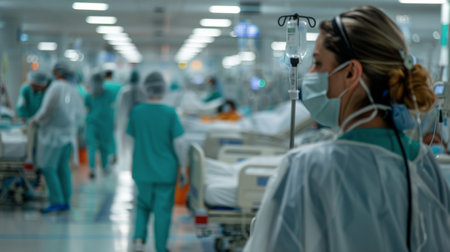 Healthcare professionals in scrubs and masks are actively attending to patients in a bustling hospital ward filled with beds and medical equipment during the day.