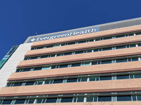 Kirkland, WA / USA - circa March 2020: Low angle view of Evergreen Health Medical Hospital in Totem Lake during the Covid-19 coronavirus outbreak.