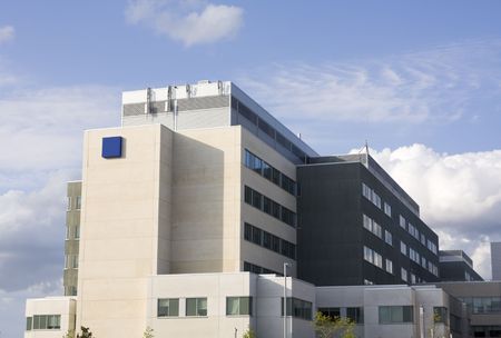 A sleek modern hospital building featuring large glass windows and bright reflections
