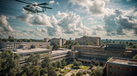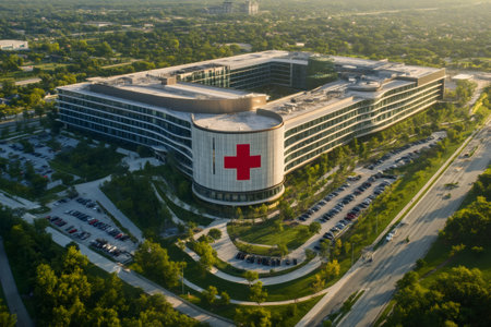 Aerial view of a contemporary hospital complex with a prominent red cross, symbolizing medical care within a bustling city landscape
