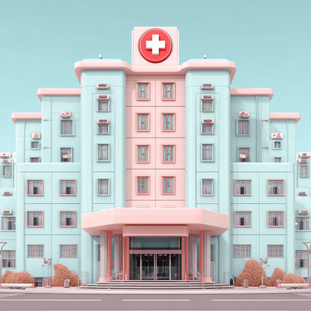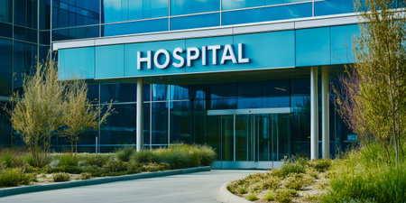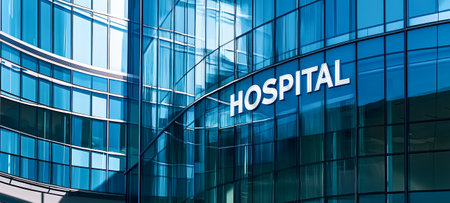 A contemporary hospital featuring a glass facade with the word hospital prominently displayed