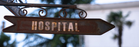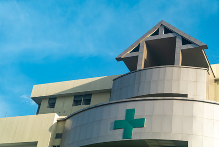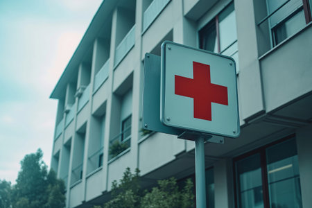 Clear photo of a hospital sign featuring a prominent red cross, symbolizing medical care and emergency services, against a blurred building backdrop