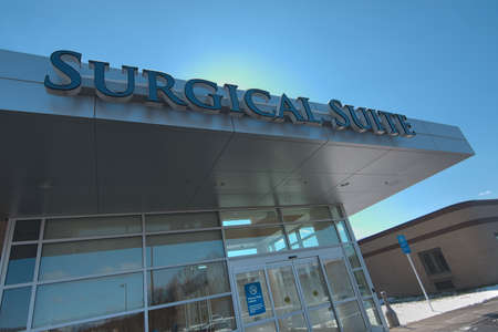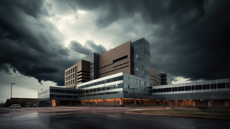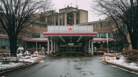 The image showcases the front entrance of a large building, potentially a hospital or office complex, under overcast skies. The scene displays elements of a winter landscape, including bare trees and traces of snow. This visual might be suitable for various commercial or editorial applications such as articles about architecture or healthcare.
