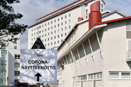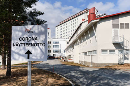 Joensuu, Finland - April 19, 2020: Road sign to Coronavirus sampling in Siun Sote Public health department in the Finnish language Corona-naytteenotto