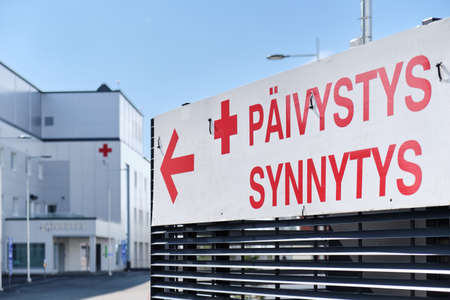 Joensuu, Finland - April 19, 2020: Road sign in the direction of hospital emergency rooms in the Finnish language.