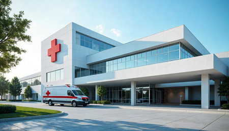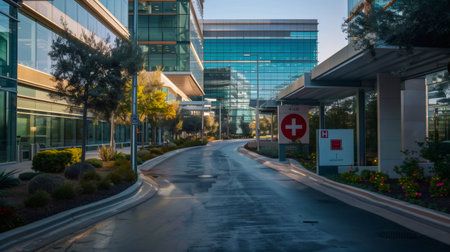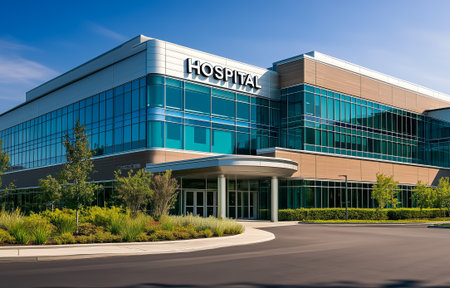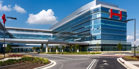 Modern hospital building with glass facade and curved driveway on a sunny day