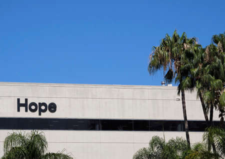 The word Hope written on a building in Los Angeles, with the blue sky above