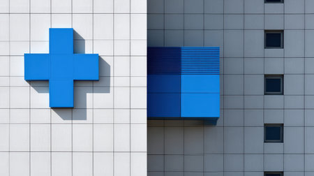 Bright blue medical cross symbol on a modern building facade representing healthcare, wellness, and urban architecture in a clear blue sky setting