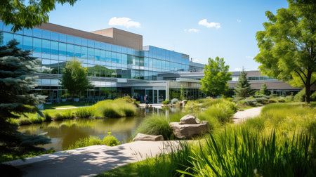 A contemporary hospital center showcasing glass architecture, peaceful pathways, and vibrant landscaping