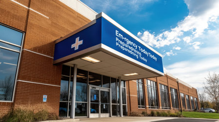 A large building with a blue sign that says Emergency Preparing Today. The building is brick and has a lot of windows