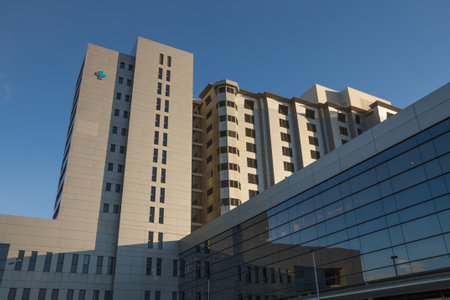 Malaga, Spain - April 10, 2020: A view of Hospital Universitario Virgen de la Victoria facade