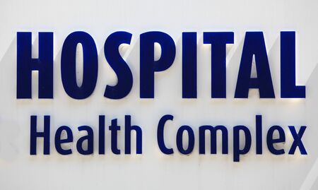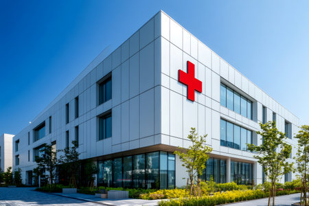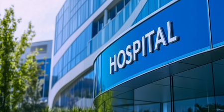Modern hospital building displaying a prominent healthcare sign and landscaped entrance