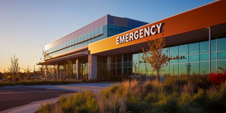 A contemporary emergency room building showcasing large glass windows and vibrant landscaping at sunset
