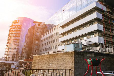 Two large buildings are seen with glass surfaces and construction work happening. The sun shines brightly over the scene.