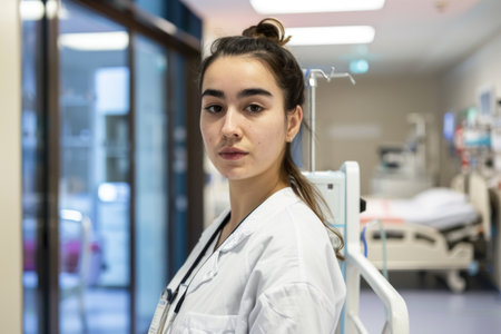 Portrait of a beautiful young nurse in a hospital corridor. Shallow depth of field.