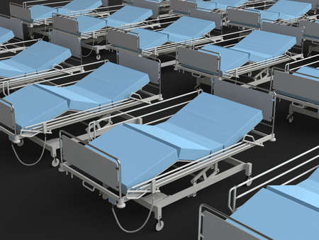 Rows of hospital medical beds set up side by side