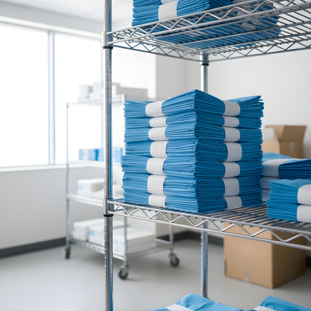 A stack of folded, sterile blue surgical towels and drapes placed on a metal shelf in a supply room. Natural light from a window