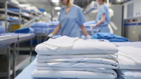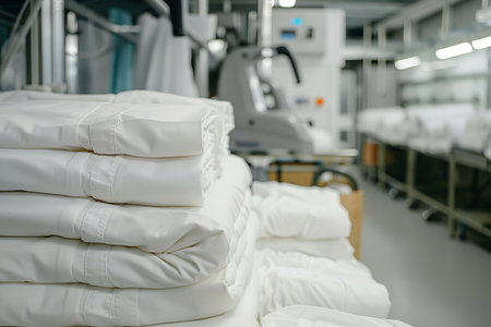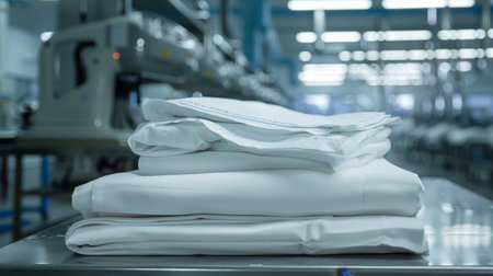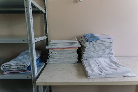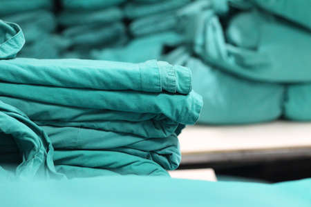 Industrial laundry equipment with stack of folded clean sheets and surgical clothes