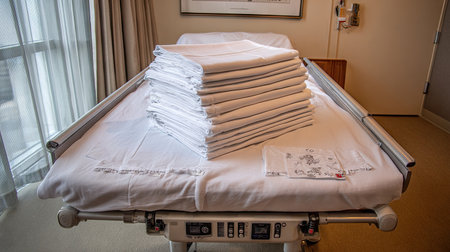 Freshly laundered bed linens are stacked neatly on a hospital bed, set in a well-lit room, creating a clean and soothing atmosphere for patient care.
