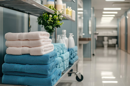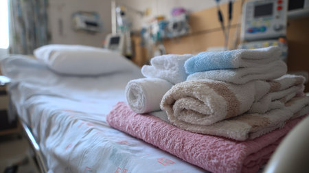 A well-organized view of a hospital bed featuring neatly folded towels, creating a calming atmosphere in a healthcare setting. The soft lighting adds warmth, enhancing patient comfort during their stay.