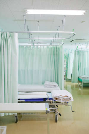 Interior of a hospital ward with empty beds for patients and emergency doctors.