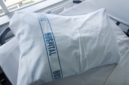 Hospital pillow on hospital bed.