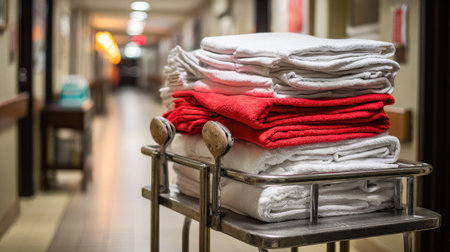 Clean and folded linens stacked on housekeeping cart in hotel hallway