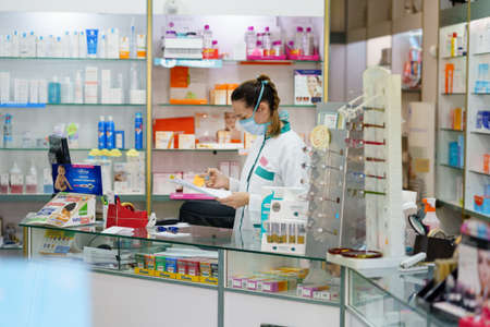 GRANADA SPAIN 23RD APRIL 2020 Pharmacist working in her pharmacy protected by a mask