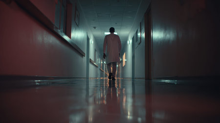 A doctor walks down a hospital corridor at night, alone and deep in thought about important decisions that need to be made.