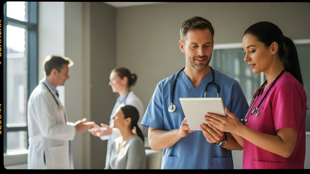 A male and female medical professional in blue scrubs and white lab coat standing in a hospital corridor, looking at a digital tablet, with colleagues in the background.