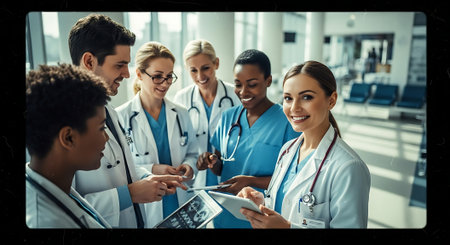 Group of doctors and nurses in scrubs and lab coats gathered around a tablet in a modern hospital environment.