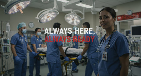 A striking medical advert featuring dedicated healthcare professionals in a highstakes operating room, emphasizing teamwork and readiness for emergencies, showcasing the unwavering