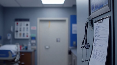 A stethoscope hangs on a clipboard, with a clinical setting in the background. This image portrays a professional medical office environment, emphasizing care and attention to patient wellbeing.