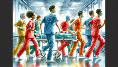 The image depicts a team of healthcare professionals urgently transporting a patient in a hospital.
