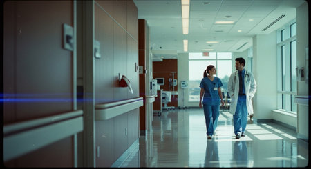 Bustling Hospital Corridor with Medical Staff and Equipment with Generative AI.