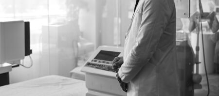 Interior of a hospital ward with empty beds for patients and emergency doctors.