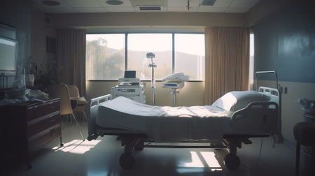 AI Generative Interior bright hospital room in medical clinic, healthcare and recovery after surgery or illnes