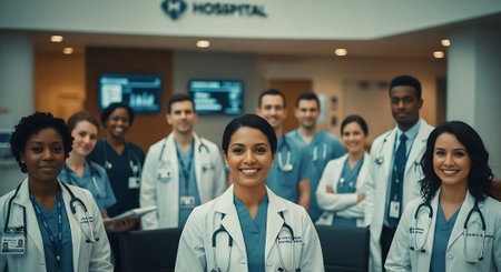 A diverse team of doctors and nurses in scrubs and lab coats posing together in a modern hospital environment.
