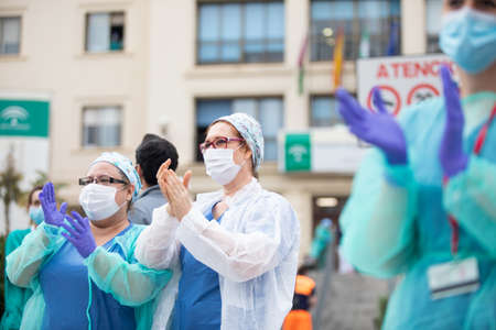 Malaga, Spain. 16th Apr 2020. Covid-19 Tribute applause to health personnel of the Hospital Carlos Haya of Málaga from local Police and Firemen.