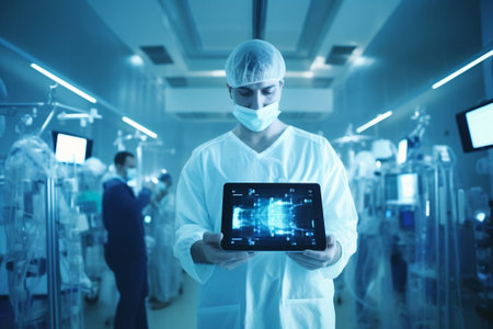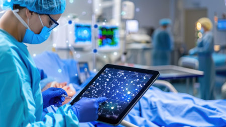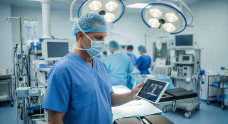 A masked surgeon in blue scrubs examines medical scans on a tablet in a bright operating room. Other medical staff and equipment are visible in the background. AI-generated content